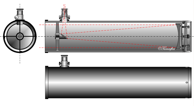 Los telescopios reflectores constan de un tubo donde van montados los espejos, cuya geometría puede ser circular, parabólica o hiperbólica. La combinación de los espejos llevan la imagen hasta el punto focal.