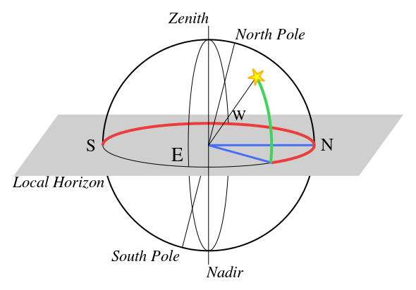 Coordenadas altazimutales: en estas, el cielo se divide en aros concéntricos medidos en altitud desde el horizonte hasta el punto más alto en el cielo (zenith) y en acimut desde el norte, continuando 360° hacia el este.
