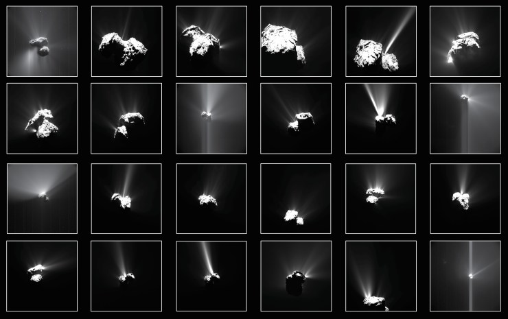 Como puede verse en este montaje de imágenes, algunas de las emisiones fueron chorros largos y estrechos que llegaban muy lejos del núcleo del cometa, mientras otras tenían una base más ancha y se expandían más hacia los lados. Otras parecen una combinación de ambas.