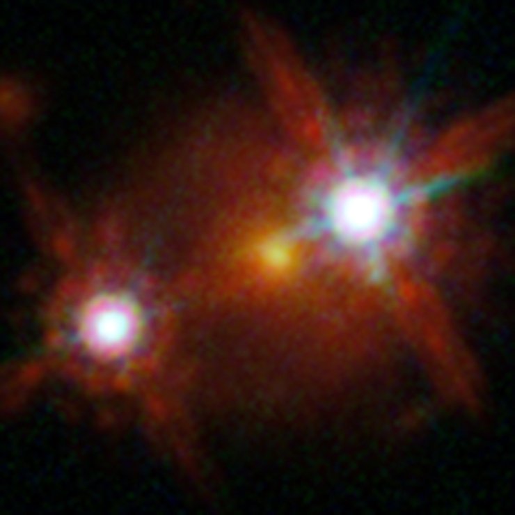 Una imagen que fue obtenida usando el telescopio espacial Hubble nos muestra tres objetos. Dos de los más brillantes (en la parte superior derecha e inferior izquierda) son imágenes magnificadas por una lente gravitacional de un muy distante cuasar. El objeto menos brillante entre las dos imágenes es la galaxia en la cual se ha detectado un campo magnético.