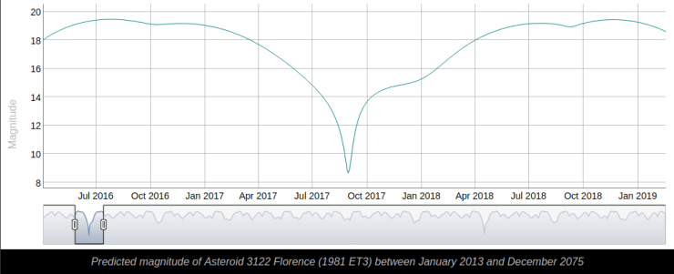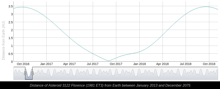 En efecto, 3321 Florence es un asteroide grande, con unos 4.5 kilómetros de diámetro, pero en realidad, no representa ningún peligro para la Tierra: el 1 de septiembre, el asteroide pasará a uno 7 millones de kilómetros, esto es, unas 18 veces la distancia a la Luna. No tenía un encuentro tan cercano desde 1890 y no volverá a estar así hasta el año 2500.