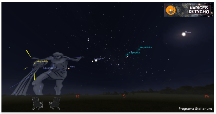 En este 2020, la luna llena de mayo será el día 7 y estará cayendo por el horizonte Oeste en la madrugada, es decir, en dirección opuesta a la salida de Acuario. Esto puede anticiparnos que la Luna podría ser un problema leve para ver las Eta Acuáridas débiles.