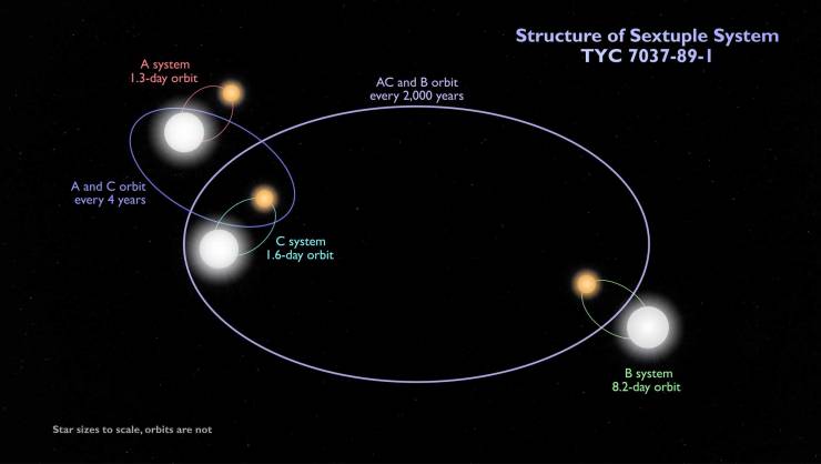 En esencia, el sistema de TYC 7037 está compuesto por tres binarias eclipsantes: pares estelares cuyas órbitas se inclinan en nuestra línea de visión y que nos permite verlas, alternadamente, una frente a la otra.