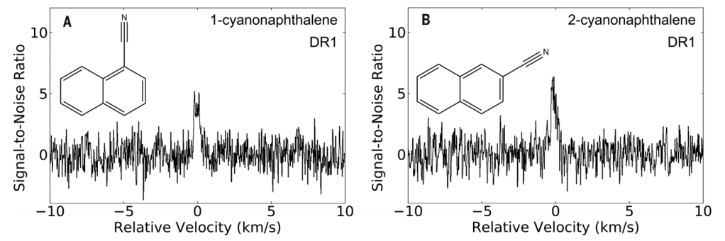 Una de las especies que tenían previsto buscar es el cianonaftaleno, que no es otra cosa que dos anillos de benceno unidos y que también presentan el ion CN sustituyendo uno de los hidrógenos de la molécula.