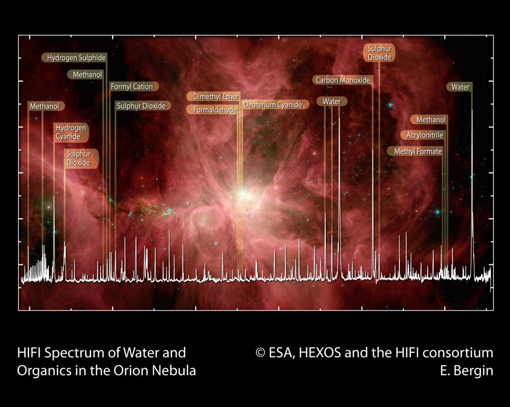 Nuestra primera fuente de información sobre los ingredientes de esa sustancia entre las estrellas son las observaciones con telescopios y antenas en diversas longitudes de onda, desde la luz visible hasta las ondas de radio. Precisamente la detección del infrarrojo y las microondas nos han permitido crear espectros que nos indican con mucha certeza las especies atómicas y moleculares presentes en las nebulosas. Al día de hoy se han reportado más de 200 tipos diferentes de moléculas.
