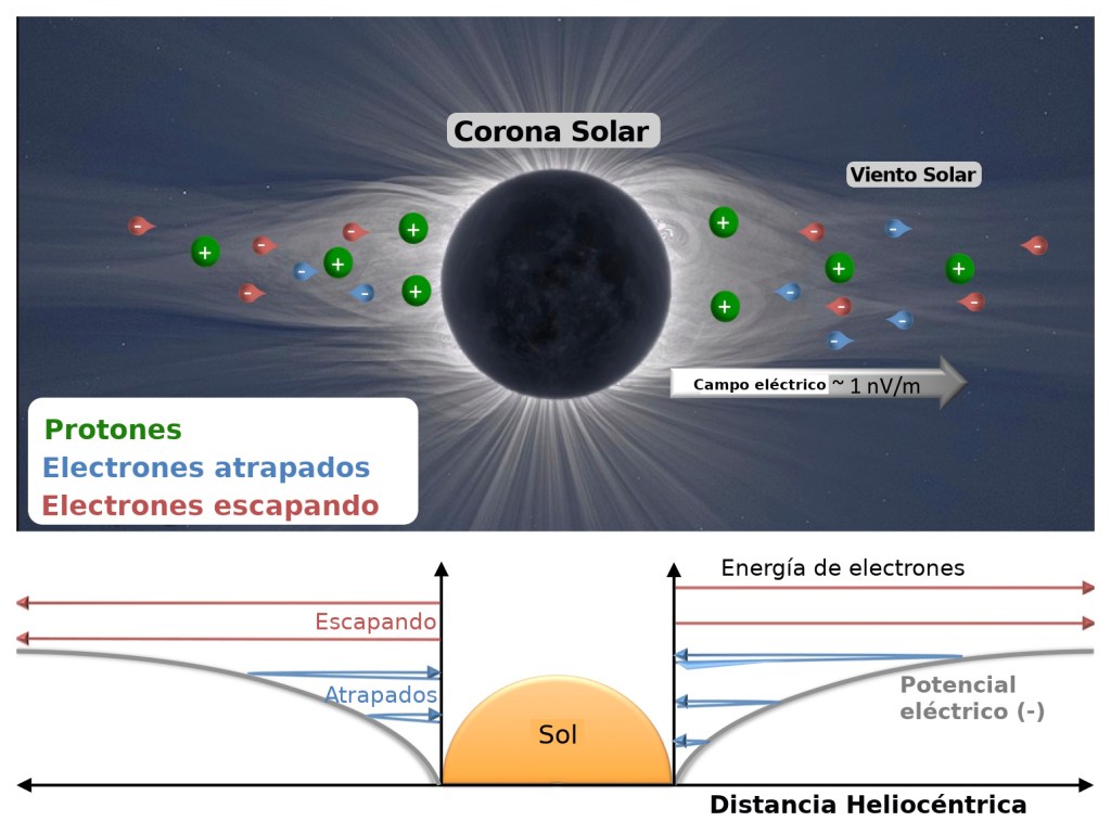 El campo eléctrico del Sol se origina de la interacción de protones y electrones arrancados de los átomos de hidrógeno al interior del núcleo solar. En este entorno, los electrones, con masas 1,800 veces menores que la de los protones, son expulsados e impulsados hacia afuera. Pero los protones, con su carga positiva, ejercen cierto control hacia los electrones debido a su carga opuesta.