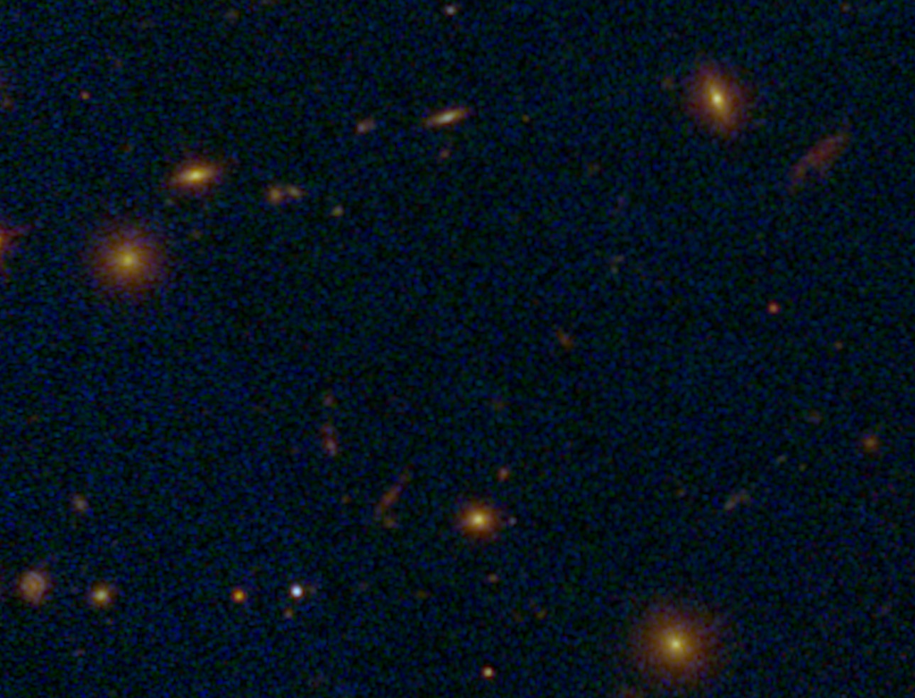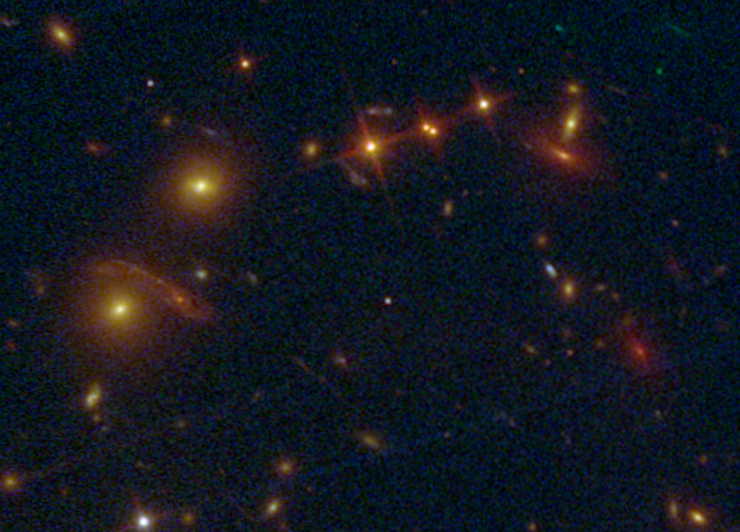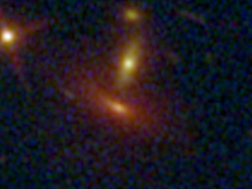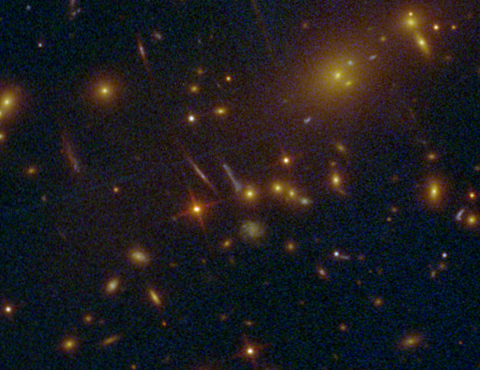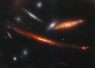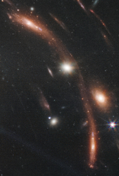 Un fenómeno muy interesante y claramente visible son las líneas curvas en algunas partes de la imagen. En realidad se trata de imágenes de galaxias mucho más lejanas que el campo principal del cúmulo (en primer plano), cuya luz se distorsiona por la curvatura del espacio tiempo. La masa del cúmulo, materia ordinaria más materia oscura, es tan grande, que produce el fenómeno de «lente gravitacional», permitiendo escudriñar mucho más lejos y más atrás en el tiempo.