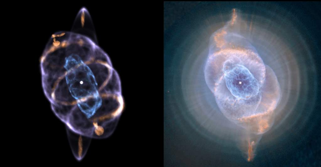 Bien, pues un grupo de astrónomos han creado el primer modelo computacional en tres dimensiones de NGC 6543, conocida como Ojo de Gato y ubicada a unos 3000 años luz, en dirección de la constelación de Draco.