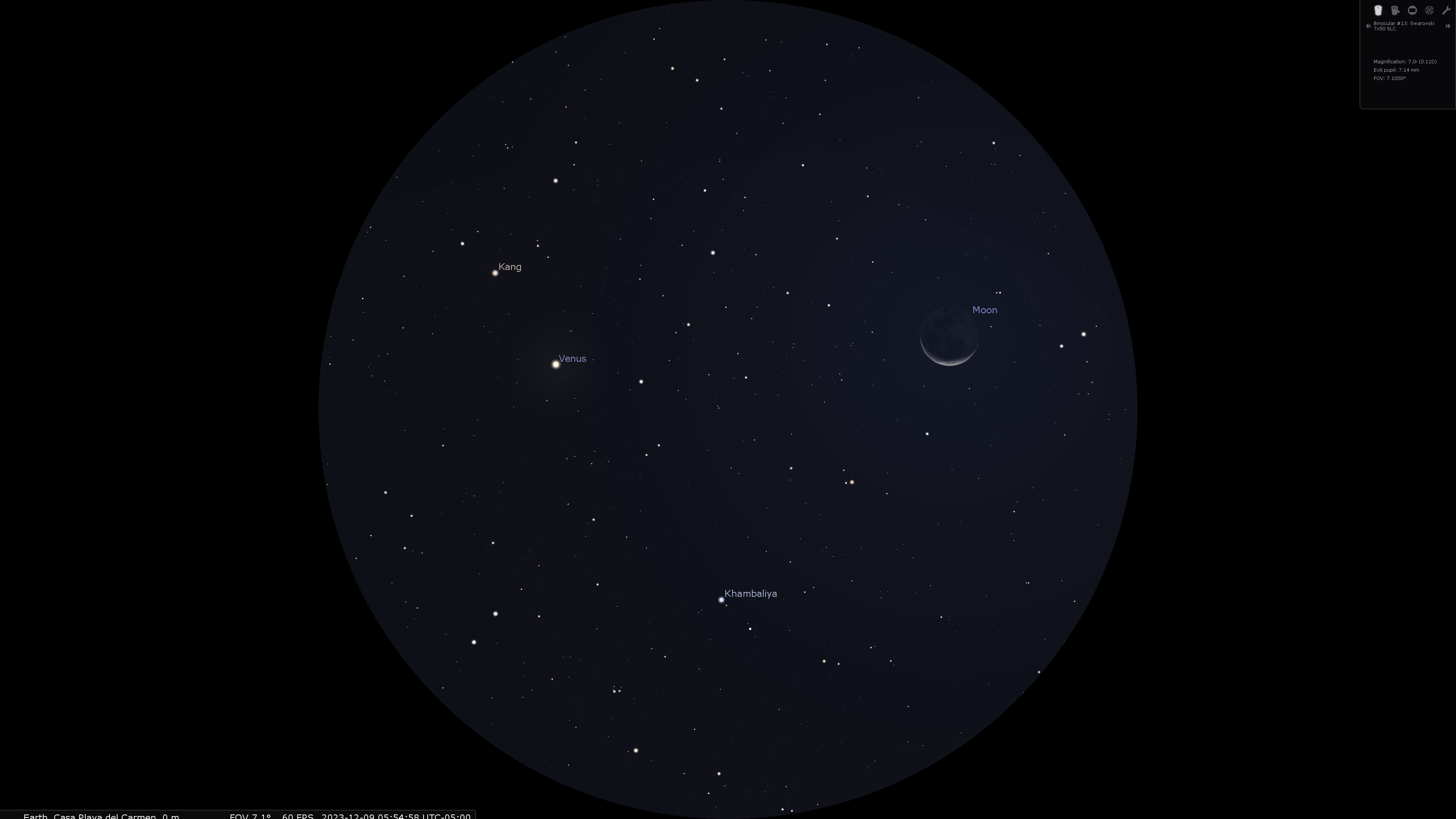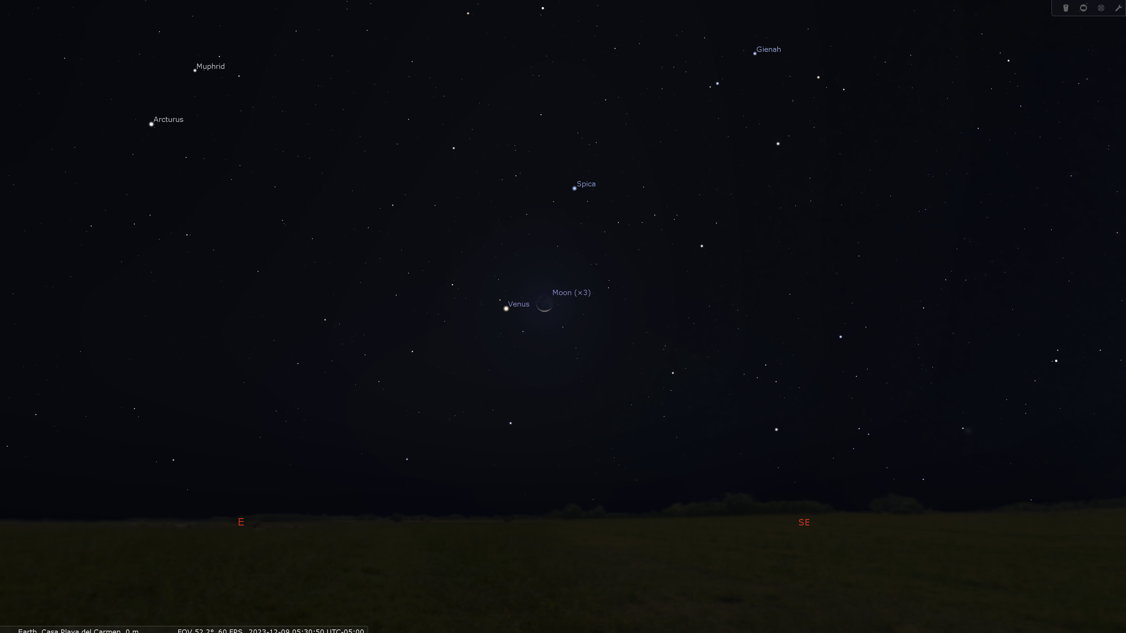 La madrugada del 9 tendremos un hermoso amanecer con el planeta más brillante y nuestro satélite apenas creciendo. Venus y la Luna estarán a menos de 4°, arropadas por las débiles estrellas entre Virgo y Libra. La estrella Spica (α Vir) se ubica al oeste a escasos 12°. Unos binoculares medianos (7×50 por ejemplo) nos mostrarán ambos objetos dentro del campo, además de las estrellas Kang y Khambaliya, κ Vir y λ Vir respectivamente. Sin duda será un paisaje ideal para captarlo en fotografía.