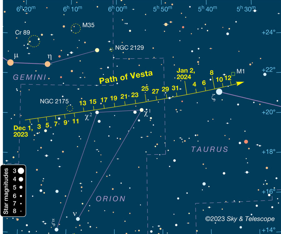 Bien pues durante las últimas semanas de 2023 y primeras de 2024, Vesta navegará entre las constelaciones de Orión y Tauro, dos clásicas de esta temporada.