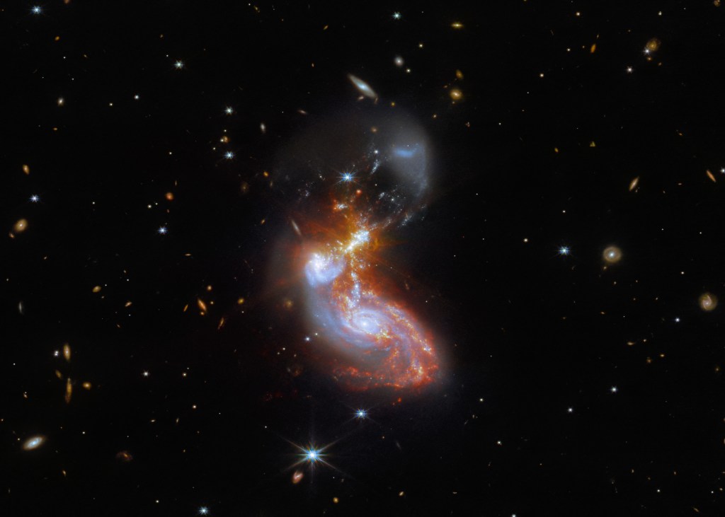 Otras están colisionando y fusionándose, y en ellas reina el caos estelar más absoluto, como en II ZW 096, a 525 millones de años luz. Aquí, los núcleos de las dos galaxias están conectados por brillantes colguijes de regiones de formación estelar, y los brazos espirales de la galaxia inferior han quedado deformados por la perturbación gravitacional de la fusión.