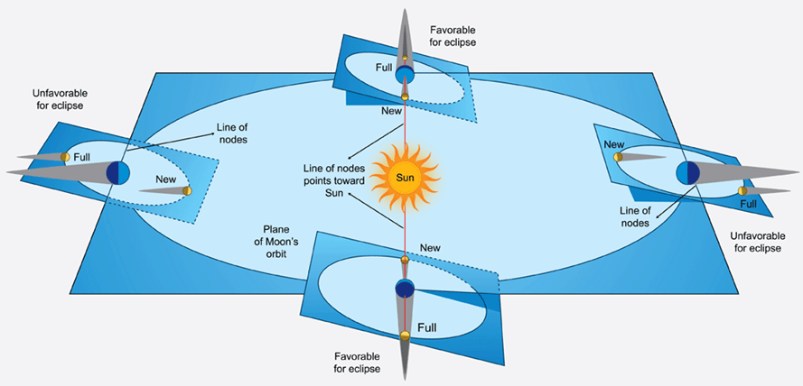 Dos o tres veces al año, la fase de luna llena coincide con su llegada a los nodos lunares en su órbita. Estos son los puntos donde la órbita de la Luna cruza la eclíptica, que es la trayectoria del Sol, vista desde la Tierra. Cuando esto sucede, la Tierra proyecta su sombra sobre la luna llena provocando un eclipse lunar. Por otro lado, los eclipses solares ocurren si la Luna se acerca a los nodos lunares alrededor de la luna nueva.