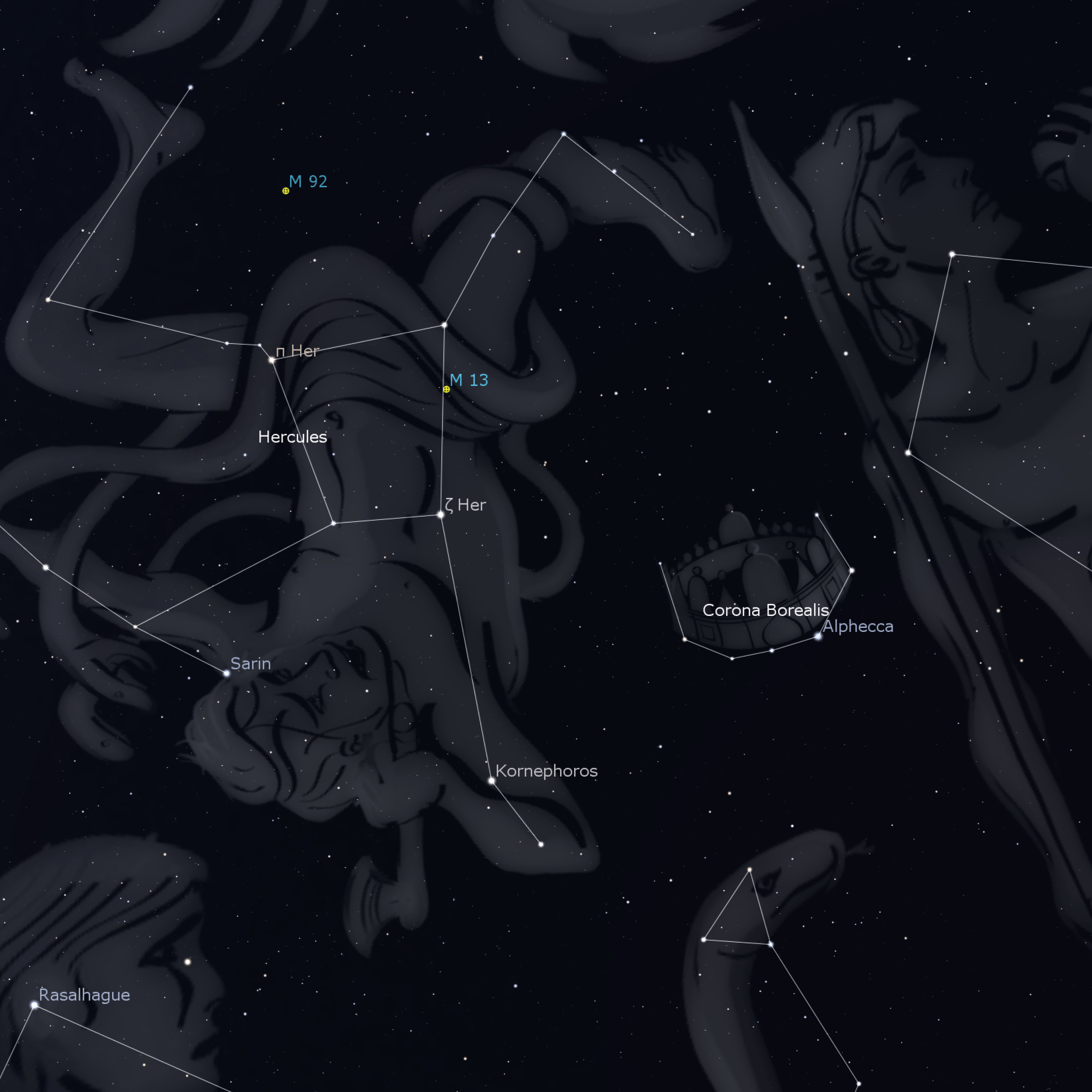 Una vez que reconoces las estrellas más brillantes que forman «el arco», usa a Alphecca, la estrella alfa, para «ir hacia Hércules» estrella por estrella.
