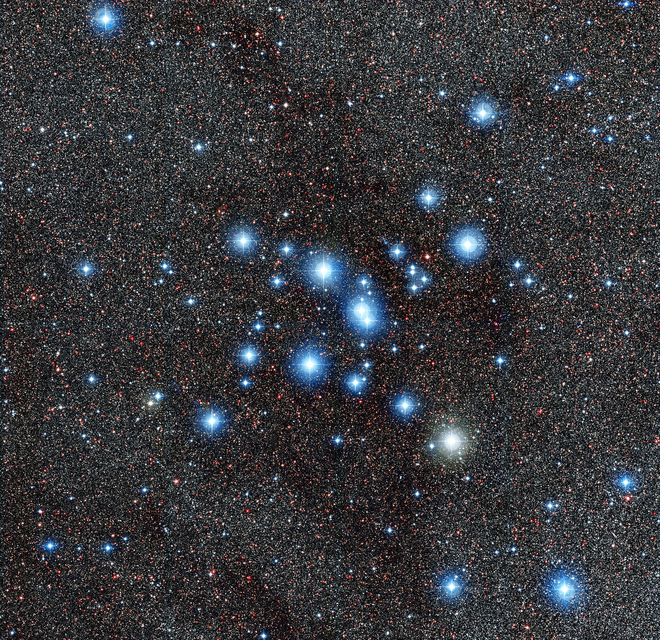 M7 está a unos 980 años luz, brilla con magnitud de 3.3 y abarca un área en el cielo de unos 1.3 grados, lo que corresponde a un tamaño real de unos 25 años luz de diámetro. El cúmulo consta de unas 80 estrellas, la mayoría dispuestas en una región central de sólo 12 años luz. Curiosamente, M7 muestra una segregación de masa pronunciada, con sus estrellas más masivas en el centro del cúmulo, una característica típica de los sistemas estelares dinámicamente evolucionados.