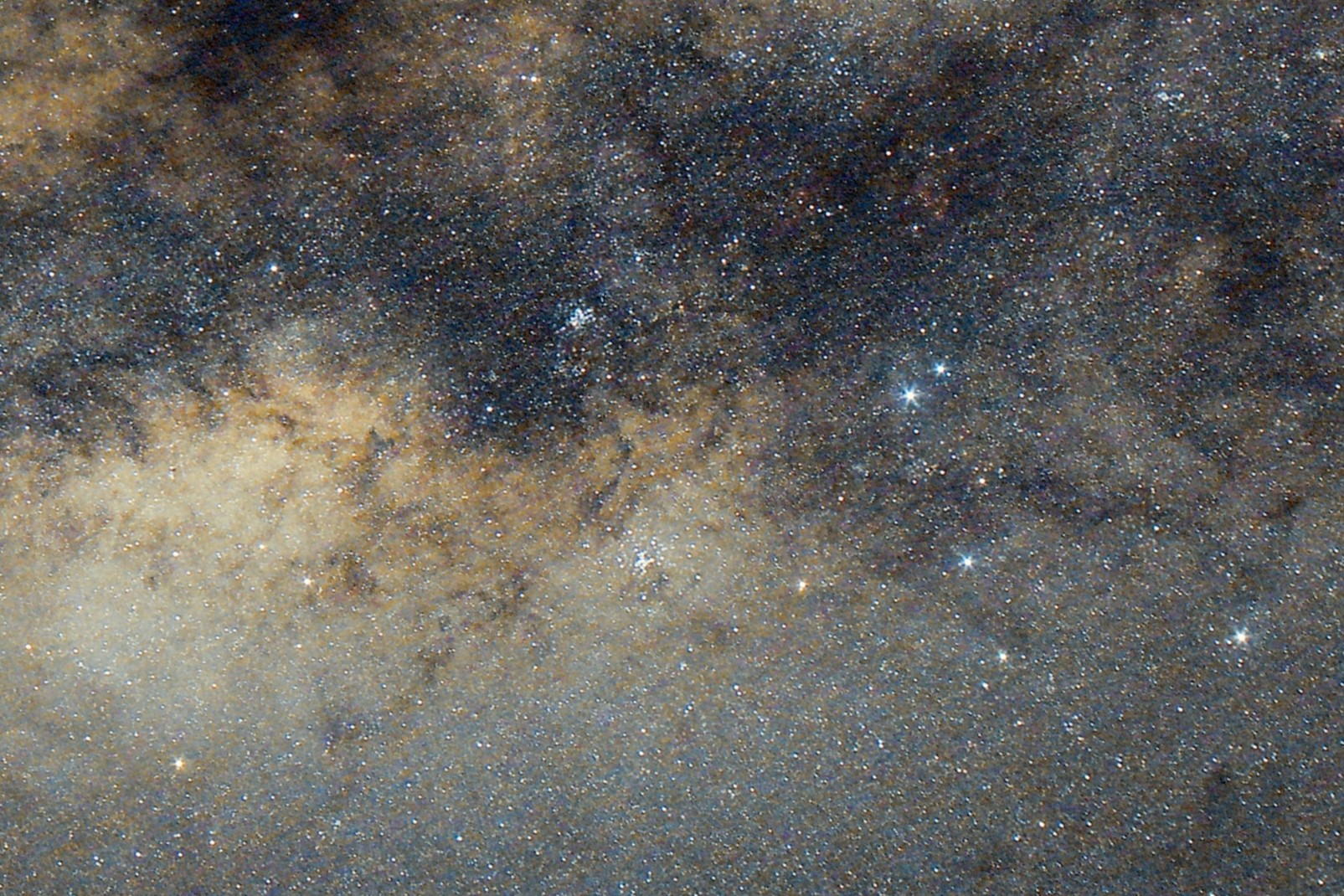 Cerca del aguijón de la constelación del Escorpión se encuentran los cúmulos estelares Messier 6 y Messier 7. De los dos, M7 es más el brillante y es visible a simple vista bajo cielos oscuros. Unos binoculares de buena calidad ofrecerán un campo que combina bandas brillantes y oscuras de gas, polvo y estrellas, junto con la pequeña colección de estrellas blancas y doradas que forman el cúmulo.