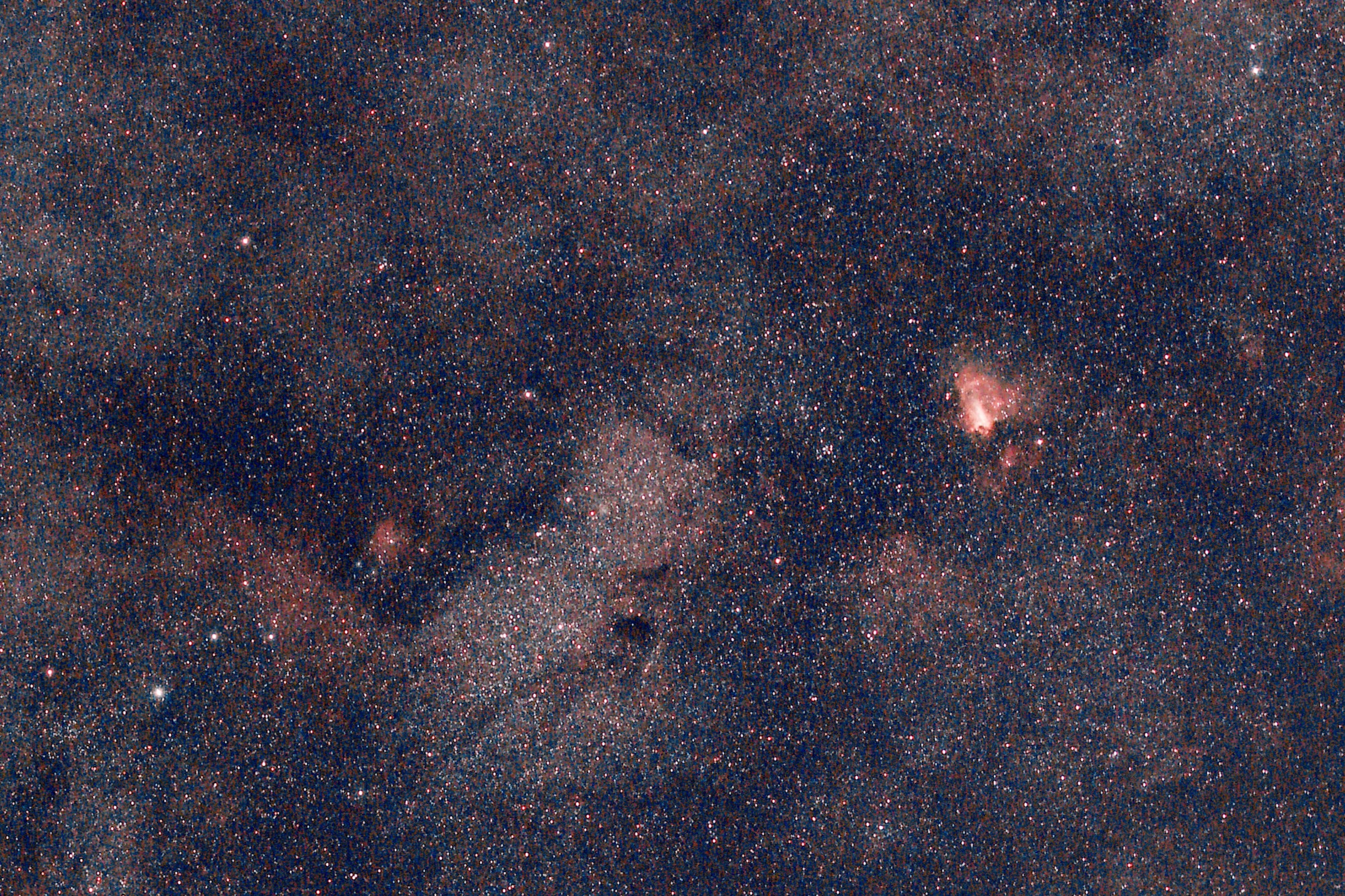 Con buena calidad del cielo, descubriremos que el hemisferio occidental de la nebulosa es el más brillante, debido a las estrellas de cúmulo NGC 6530 incrustadas en la zona.