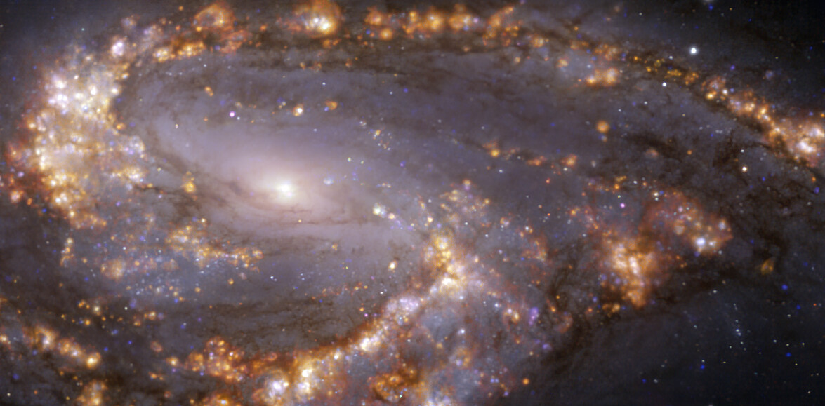 La imagen de la derecha combina los datos con MUSE y ALMA, en ondas de radio milimétricas. NGC 1300 tiene unos 110,000 años luz de diámetro y es parte del Cúmulo de Eridanus, integrado por unas 200 galaxias.
