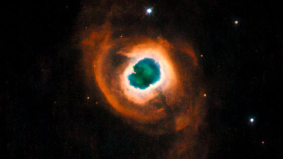 La imagen despliega una estructura fascinante: un anillo central brillante rodeado por una envoltura exterior más tenue y extendida. Los colores vibrantes nos cuentan una historia física. El intenso color verdoso del centro proviene del hidrógeno ionizado, excitado por la radiación ultravioleta de la estrella central moribunda, ahora una enana blanca. El halo exterior muestra tonos rojizos y naranjas producto del nitrógeno. Los colores en azul muestran el oxígeno. Esta paleta cósmica, extendiéndose por casi un año luz, es el legado gaseoso de una estrella que expulsó sus capas externas al espacio.