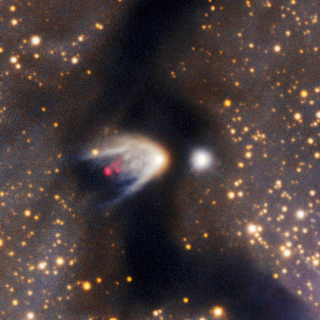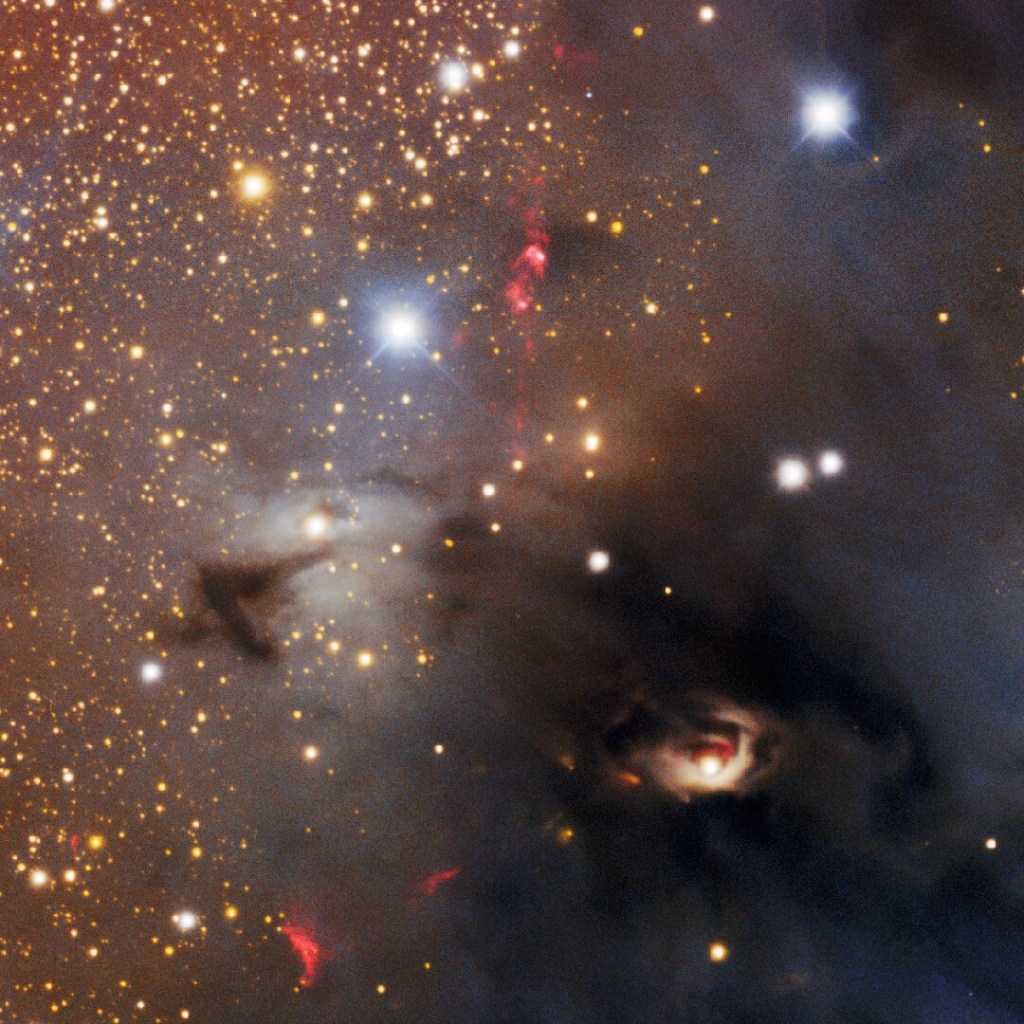 Aunque las estrellas recién nacidas (conocidas en astronomía como Objetos Estelares Jóvenes o YSOs por su acrónimo en Inglés) están envueltas en material denso, delatan su presencia de varias maneras en la imagen. Por ejemplo, aprecian pequeñas bolsas de luz que irrumpen a través de las nubes oscuras, emanando desde las estrellas en formación. A menudo, estas estrellas expulsan potentes chorros de material, llamados flujos moleculares, por sus polos a cientos de kilómetros por segundo. Estos chorros, más fáciles de detectar que las propias estrellas incrustadas, chocan violentamente con el gas circundante, esculpiendo cavidades y creando estructuras brillantes conocidas como objetos Herbig-Haro (HH).