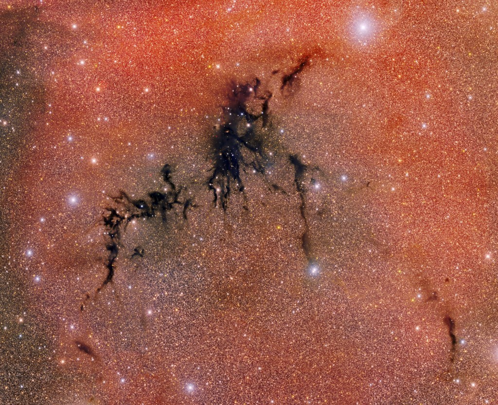 Las nubes moleculares son inmensas reservas de gas y polvo interestelar tan frías y densas que los átomos en su interior se unen formando moléculas. Algunas, como Circinus Oeste, son tan opacas que bloquean la luz visible de las estrellas situadas detrás, por eso el nombre de nebulosas oscuras. Esta nube en particular, ubicada a unos 2500 años luz en dirección de la constelación de Circinus, es parte de un complejo mayor que se extiende 180 años luz y contiene una masa equivalente a 250,000 soles.
