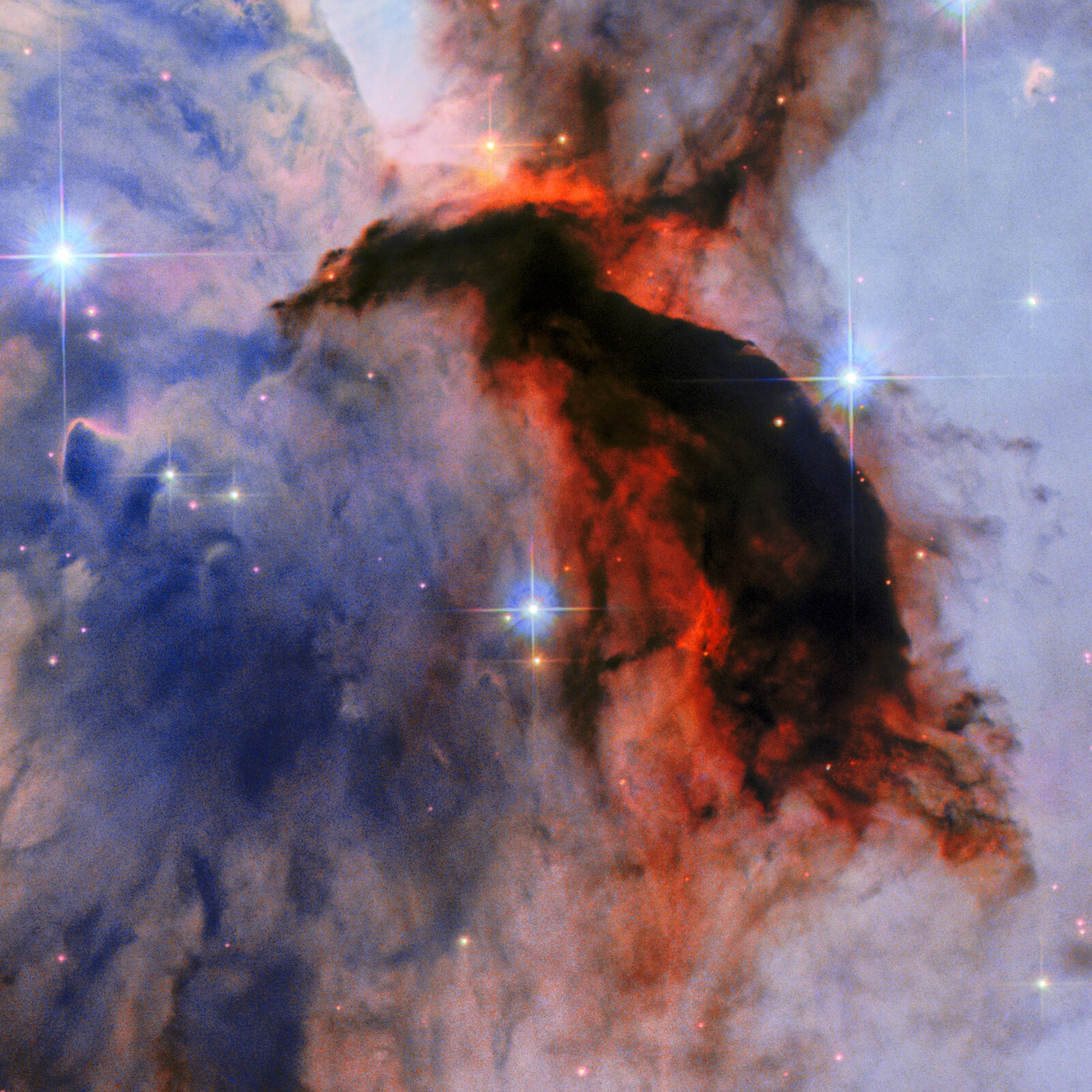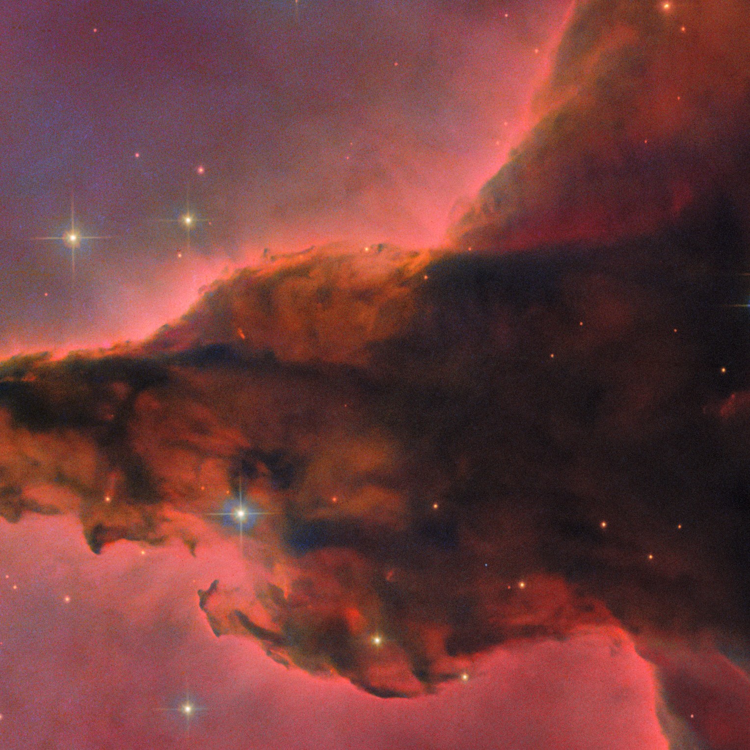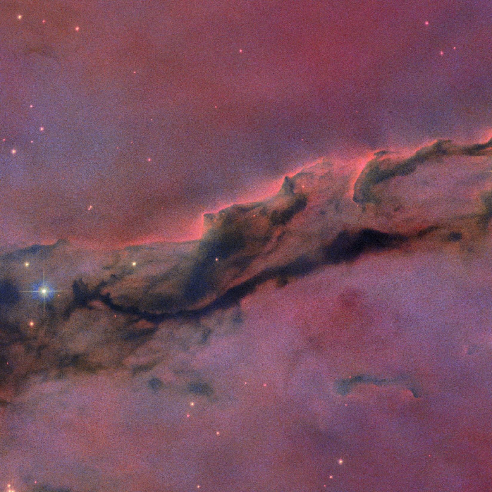 La imagen del Hubble nos revela una de las partes centrales, con las imponentes columnas oscuras esculpidas como monumentos por la intensa luz ultravioleta de las jóvenes estrellas masivas alrededor. Estas estructuras parecen emerger de un brillante tapiz rojizo: el resplandor del gas de hidrógeno ionizado que las rodea. Los bordes de estos pilares brillan intensamente donde la radiación estelar erosiona lentamente el material, creando siluetas fantasmagóricas y revelando la constante batalla entre la fuerza de gravedad y la fuerza de radiación.