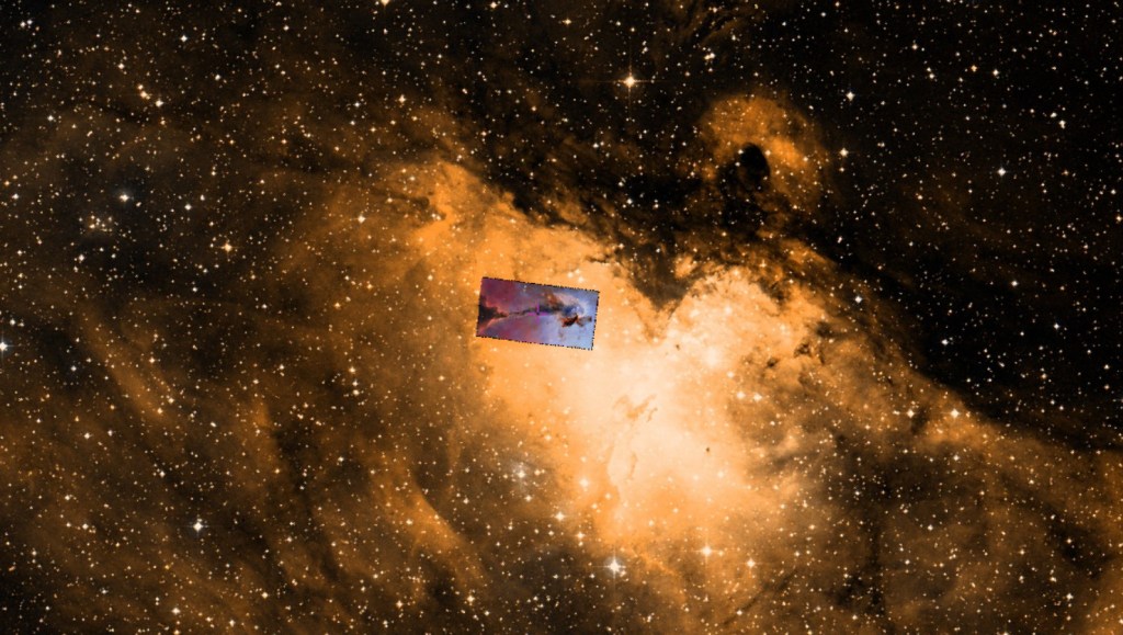A lo largo de la imagen principal ofrecida por el Hubble se despliega una notable columna de gas frío y polvo de unos 10 años luz de largo. No muy lejos de la región retratada aquí, se encuentran los famosos Pilares de la Creación, que el Hubble ha fotografiado varias veces, con imágenes publicadas en 1995 y 2015.