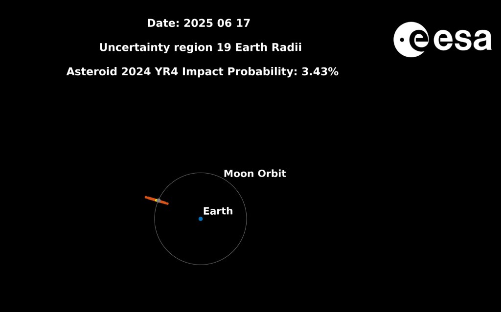 Sin embargo, la historia de 2024 YR4 no ha terminado. Las últimas observaciones antes de que el asteroide se alejara de la vista de los telescopios no lograron descartar una colisión con la Luna. La probabilidad de que 2024 YR4 impacte nuestro satélite natural en diciembre de 2032 es actualmente casi el 4%. Esta cifra se mantendrá estable, sin cambios, hasta que el asteroide vuelva a ser visible en mediados de 2028.