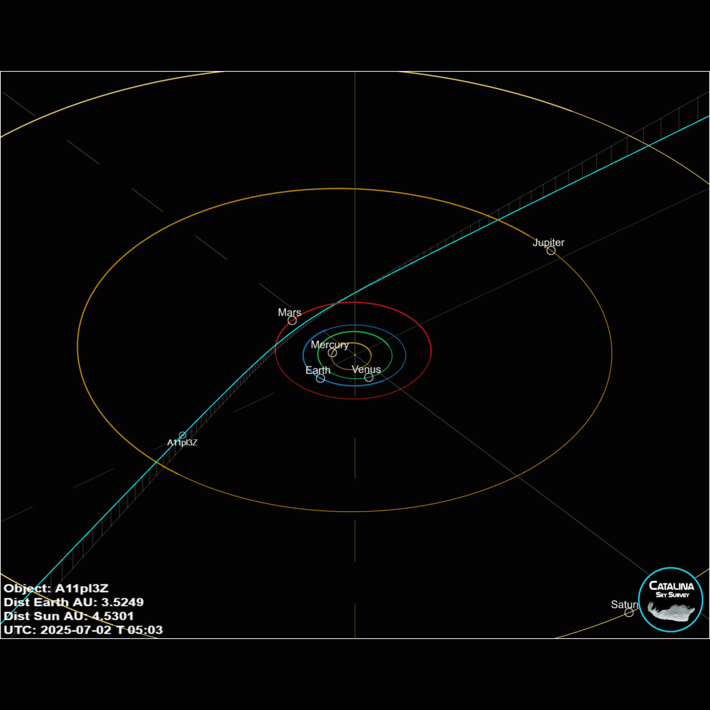 Al 4 de julio de 2025, 3I/ATLAS se encuentra a unos 670 millones de kilómetros del Sol y se espera que realice su máximo acercamiento a nuestra estrella a finales de octubre de este año, pasando justo por dentro de la órbita de Marte. Se estima que su tamaño podría alcanzar los 20 kilómetros de ancho y viaja a una velocidad aproximada de 60 kilómetros por segundo con respecto al Sol. Es importante destacar que no representa ningún peligro para la Tierra, ya que su trayectoria lo mantendrá a una distancia segura de al menos 240 millones de kilómetros.