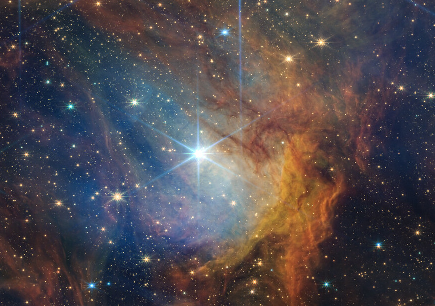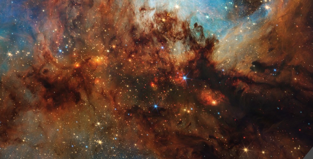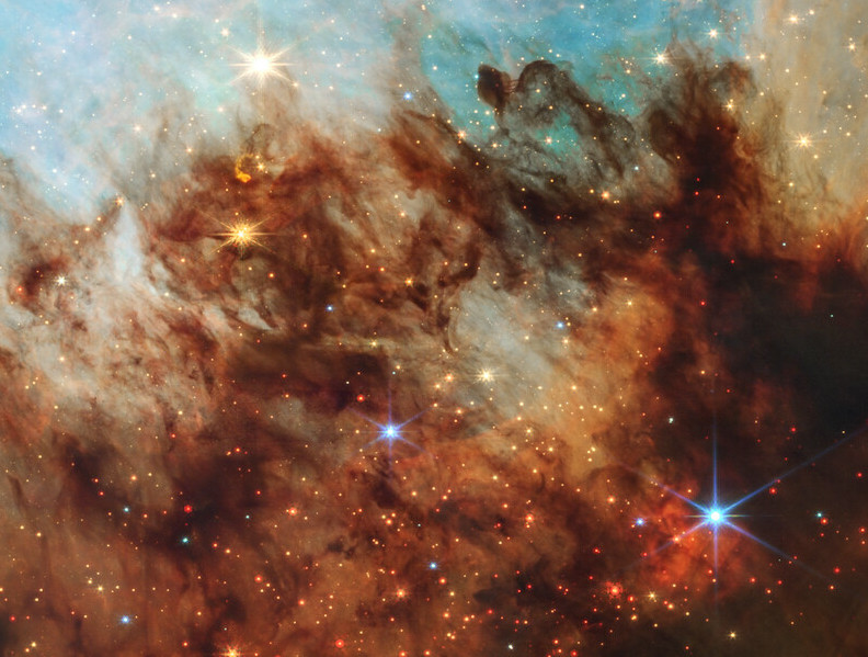 Las nuevas observaciones del Webb en luz infrarroja cercana complementan estudios previos de los telescopios Hubble y Spitzer, ofreciendo una resolución asombrosa que revela detalles estructurales nunca antes vistos. La imagen muestra cómo las jóvenes y masivas estrellas recién nacidas están esculpiendo su entorno circundante, creando cavidades y expulsando gas y polvo con su intensa radiación. Este efecto se visualiza como un brillante resplandor nebuloso en tonos azules, una escena temporal donde estas estrellas, a pesar de su corta vida, juegan un papel crucial en la evolución de la región. Su actividad energética es tan poderosa que, con el tiempo, frenará la formación estelar en su vecindad.