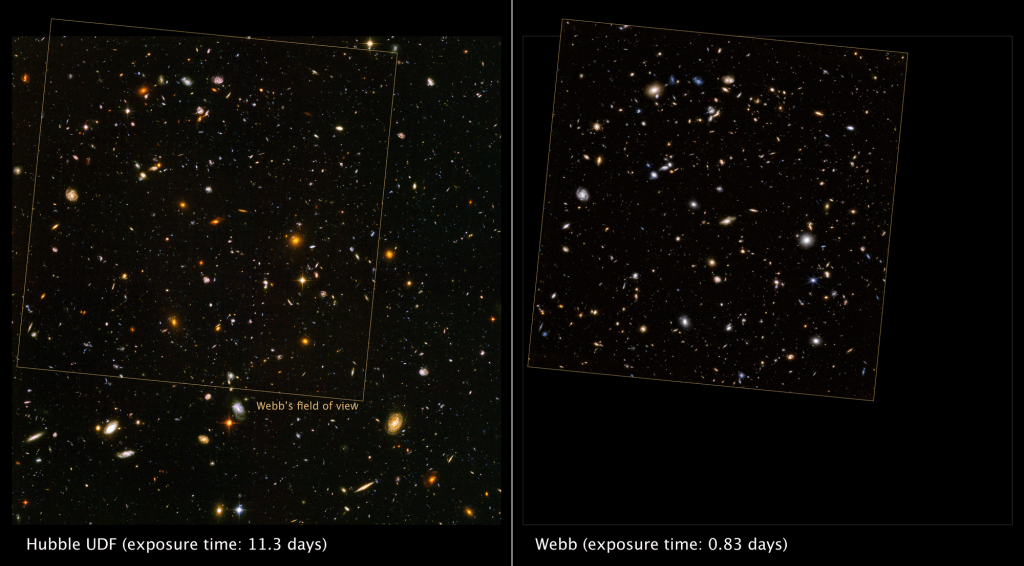 El Webb ha apuntado sus instrumentos MIRI y NIRCam a una porción del famoso Campo Ultraprofundo del Hubble. Si el Hubble necesitó 11.3 días de exposición para capturar casi 10 000 galaxias, el Webb observó la pequeña sección durante casi 100 horas, produciendo una de las vistas extragalácticas más profundas.
