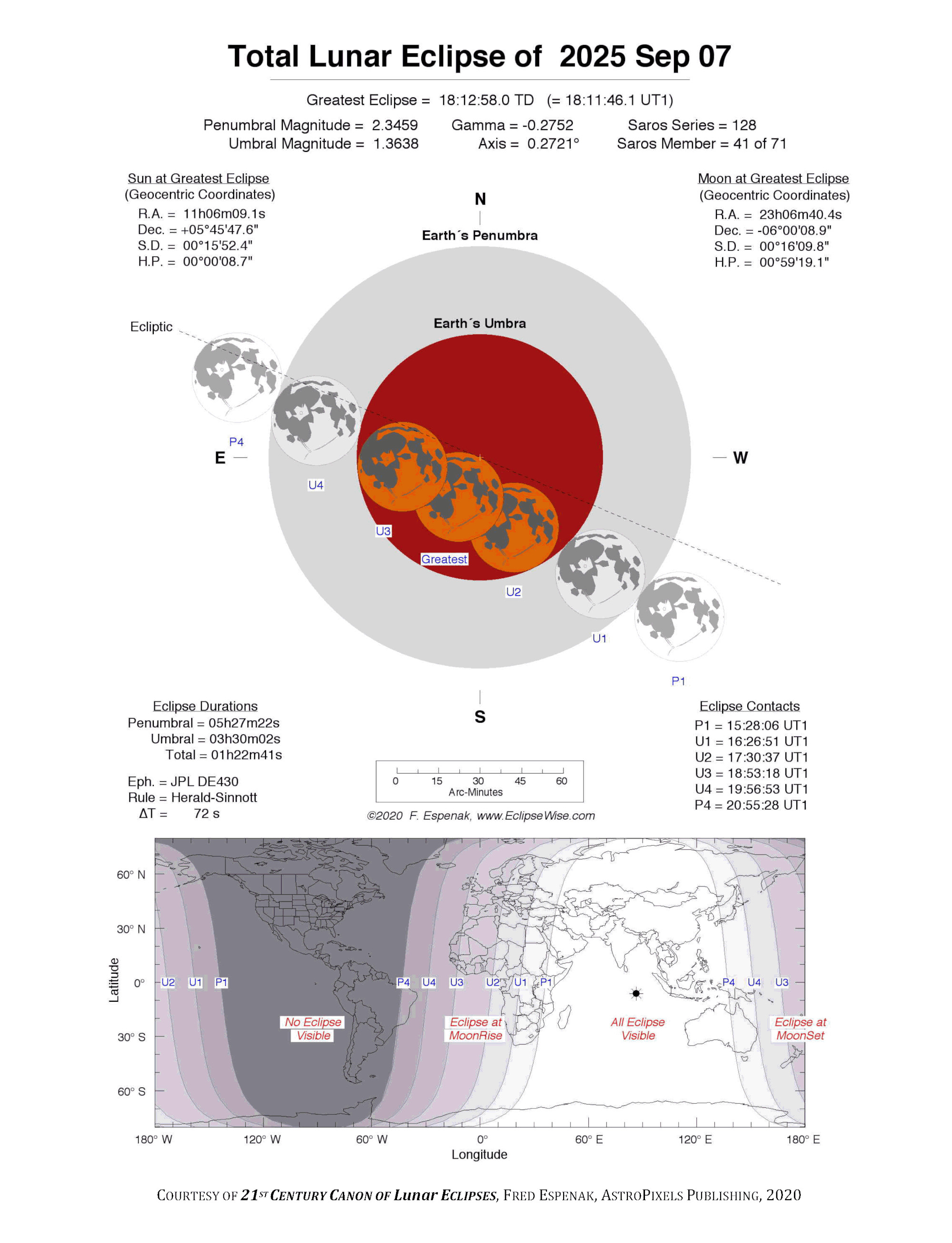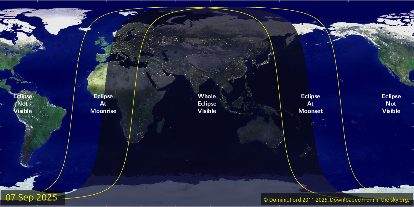 - 7 de septiembre: Luna Llena y Eclipse Lunar Total. La Luna alcanzará su fase llena a las 18:10 UTC. Esta luna llena es conocida como la «Luna de la Cosecha». Coincide con un eclipse lunar total, durante el cual nuestro satélite adquirirá un tono rojizo. El evento solo será visible en Asia, Australia, y partes de Europa y África.