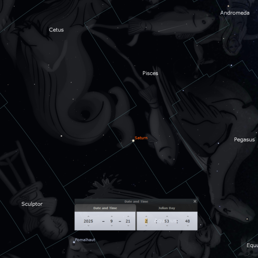 - 21 de septiembre: Saturno en Oposición. El planeta anillado estará en su punto más cercano a la Tierra y su cara visible estará completamente iluminada por el Sol. Será visible durante toda la noche, siendo el mejor momento del año para observarlo y fotografiarlo.