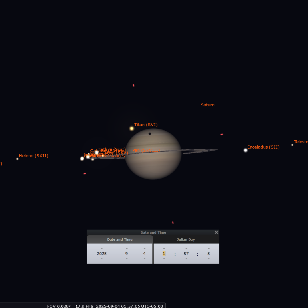 El sistema de lunas de Saturno ofrecerá su propio espectáculo. Titán, su luna más grande y brillante (magnitud 8.5), proyectará su sombra sobre el planeta en dos tránsitos visibles desde gran parte de América. El primero ocurrirá en la madrugada del 3 al 4 de septiembre y el segundo, en la noche del 19 al 20. Estos eventos, observables con telescopios de aficionado, mostrarán un pequeño punto negro moviéndose lentamente a través de las nubes de Saturno. Además, Titán será ocultado por el planeta en las noches del 11 y 27 de septiembre.