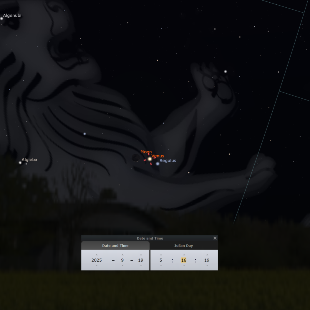 Venus será el lucero del alba, brillando con una magnitud de –3.9. El 1 de septiembre ofrecerá una vista espectacular al pasar a solo 1 grado del cúmulo estelar del Pesebre (M44). El 19 de septiembre protagonizará otro evento destacado al formar un llamativo trío con la estrella Régulo y una fina Luna menguante en la constelación de Leo.