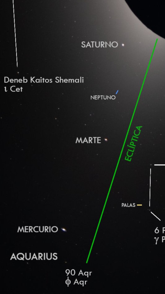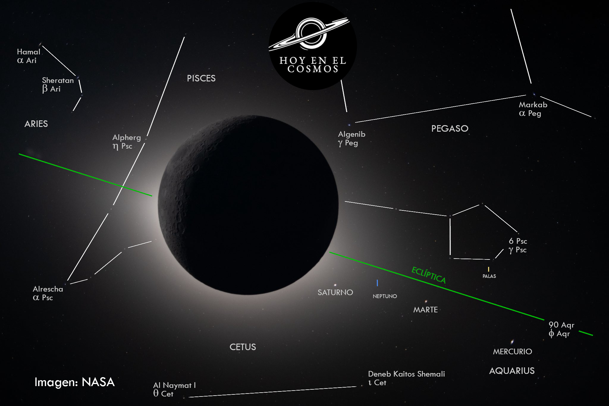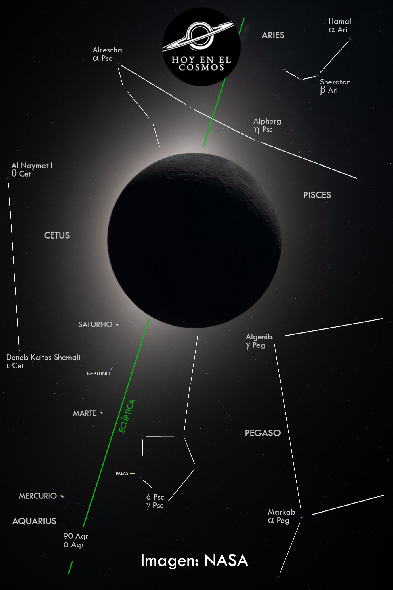 Otra retrata a la Luna cubriendo por mucho al Sol, mientras aparecen estrellas de constelaciones como Peces, Cetus, Acuario, Aries y Pegaso, incluyendo tres planetas claramente visibles: Mercurio, Marte y Saturno.