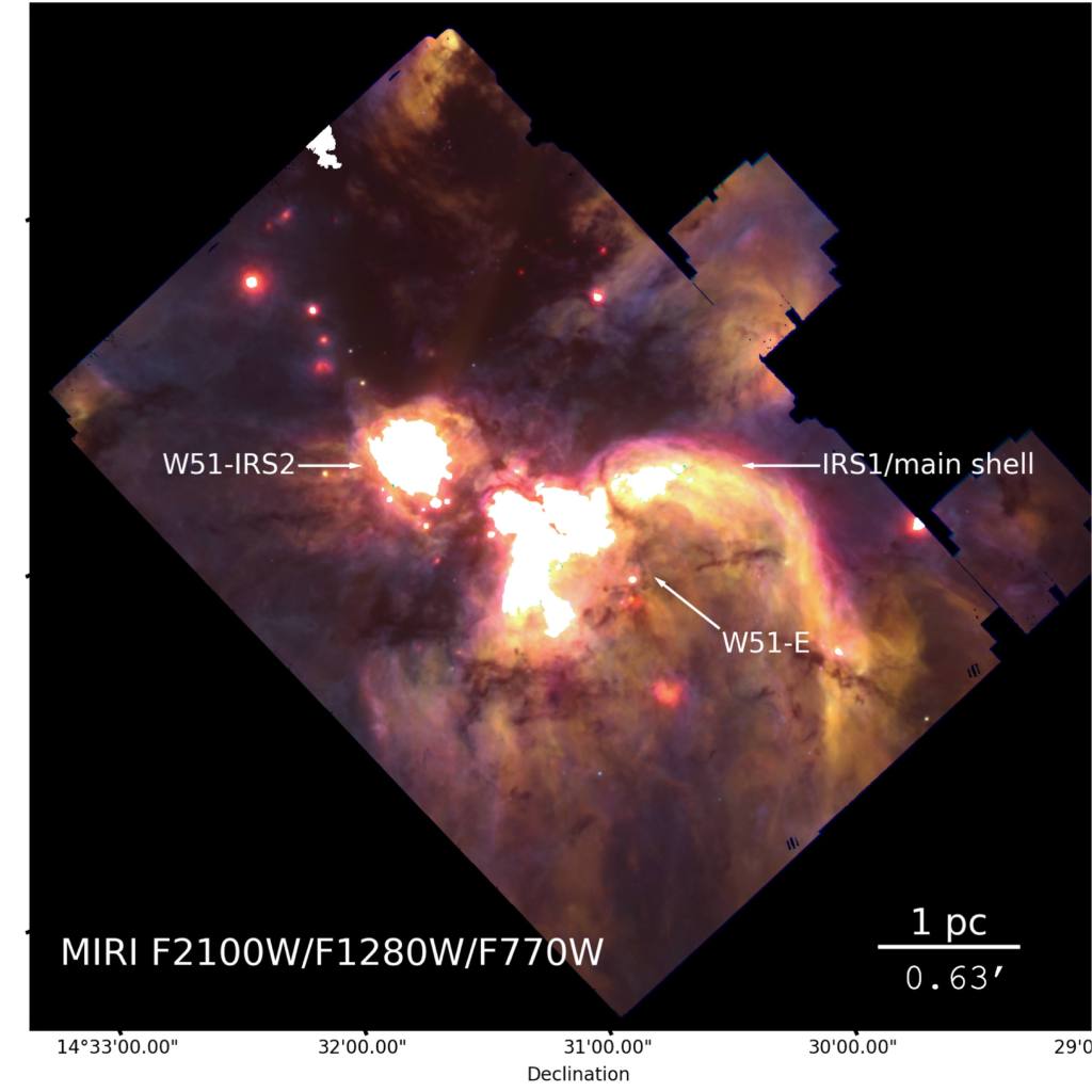 En este nuevo estudio, los científicos utilizaron los instrumentos NIRCam y MIRI del Webb para diseccionar a W51A con una resolución sin precedentes. La gran revelación de estas imágenes es la marcada diferencia entre los dos protocúmulos principales del complejo, llamados W51-E y W51-IRS2.